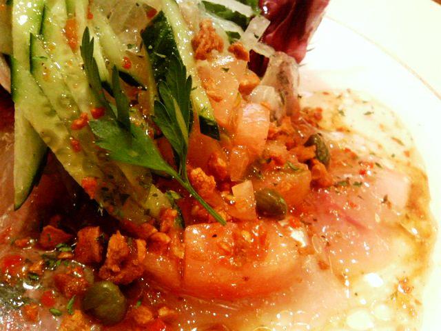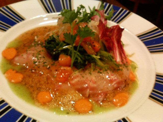 左からあつあつカマンベールチーズ・スズキのほにゃらら※・ほにゃらら※魚のわさびソース添え・茶そば